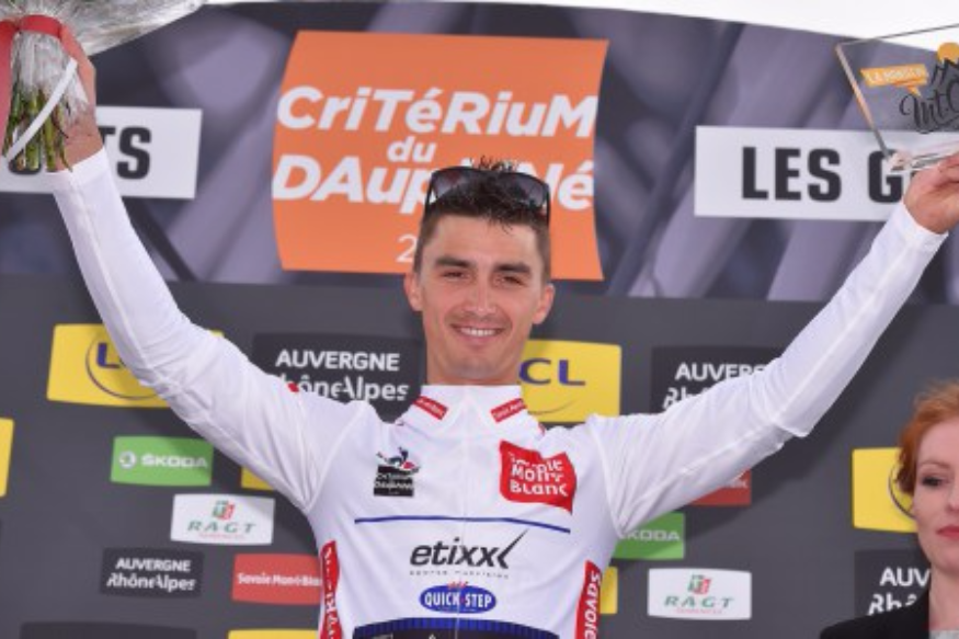 Mission accomplie pour Julian Alaphilippe (photo Twitter : @Etixx-QuickStep), à l'issue de la 6e étape du Critérium du Dauphiné, cet après-midi. Le Montluçonnais a pris la 6e place de la dernière étape à Superdévoluy, lui permettant ainsi de sauver son maillot blanc de meilleur jeune et de garder sa 6e place au général. Une belle double récompense à l'issue d'une semaine pleine pour le jeune coureur bourbonnais.
