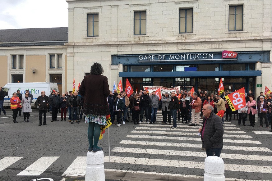 En fin de matinée, une soixantaine de cheminots et de soutiens se sont rassemblés devant la gare de Montluçon