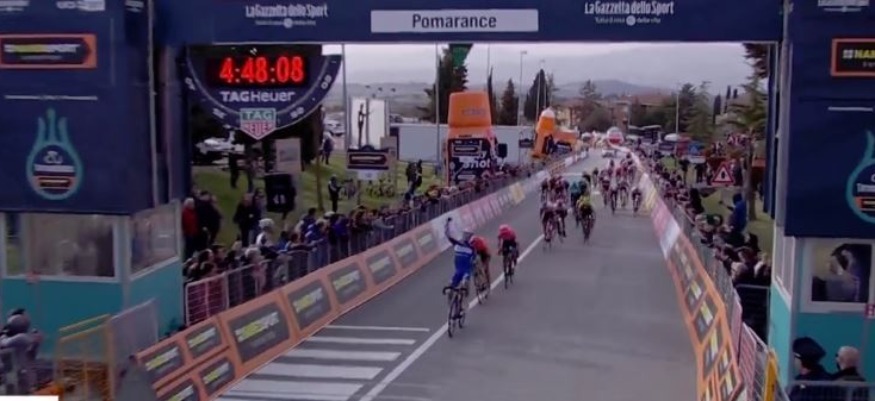Au sommet de la montée qui menait à Pomarance, le coureur Deceuninck Quic-Step a réglé au sprint, et avec une certaine facilité, un petit peloton. Il devance le champion olympique Greg Van Avermaet.