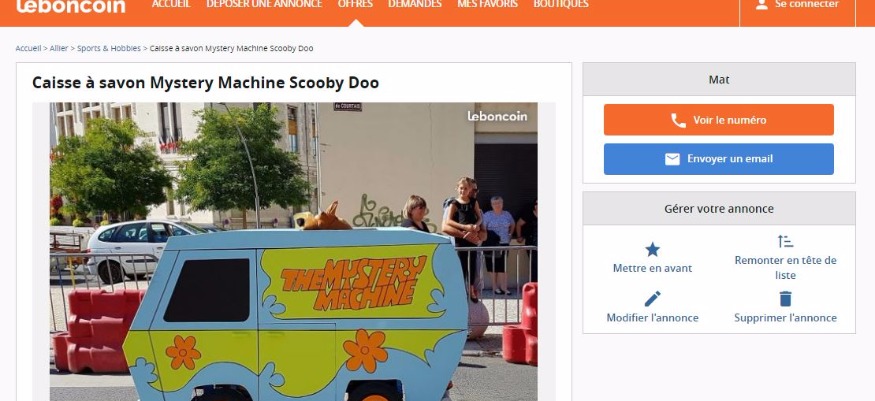Cette "mystery machine"de Scooby-doo avait fait sensation, dimanche dernier, séduisant le jury. Le vendeur précise sur le site d'annonce que l'engin est "équipé d'une direction avec 2 roues libres à l'avant montées sur roulements SKF et platines en alu, un volant de Kart, des frein à tambour arrière monté sur arbre arrière axe plein de 25, une carrosserie en contreplaqué, et 4 roues neuves 350x8". Rien que ça.