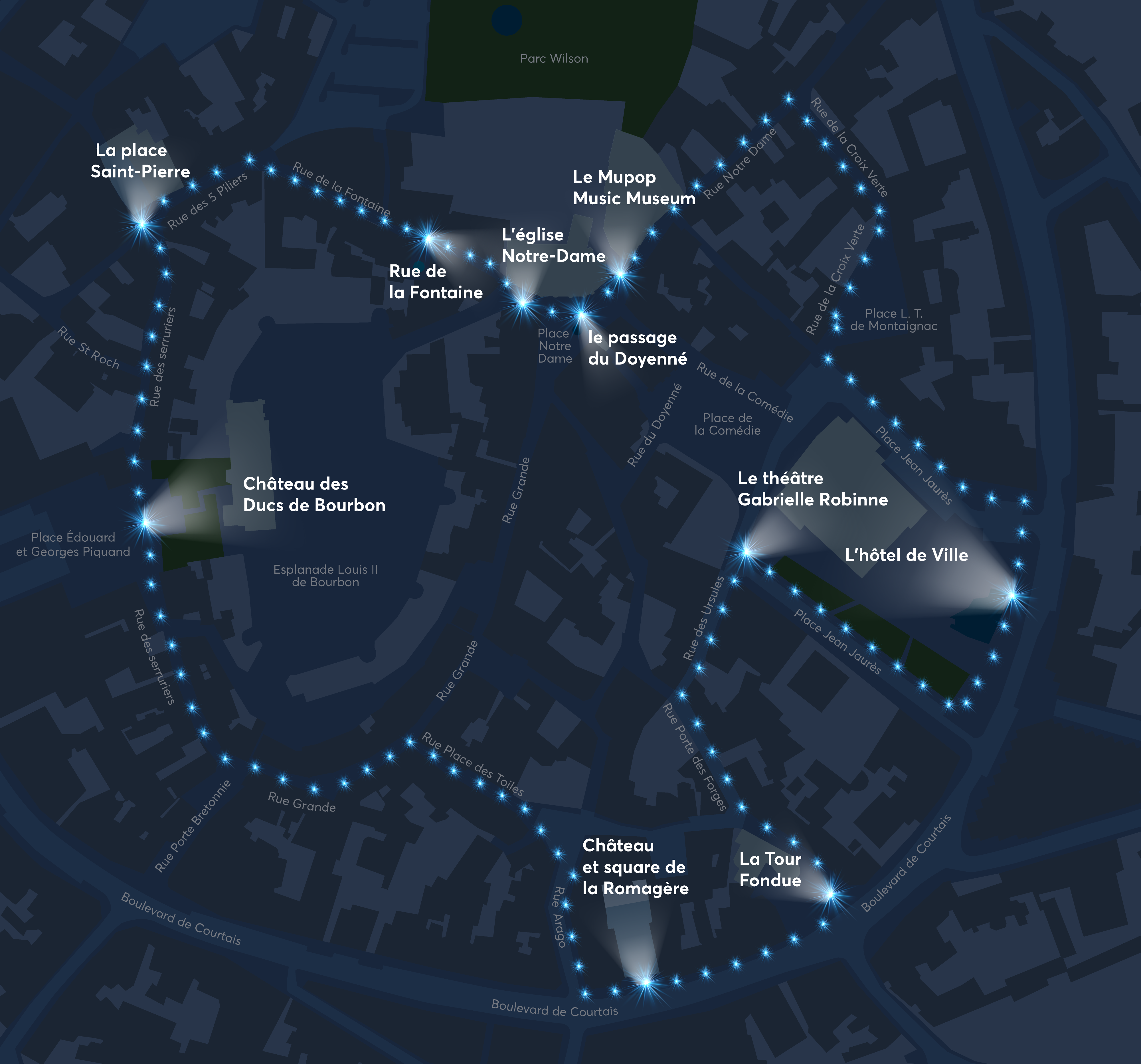 Ce parcours lumineux sera inauguré ce soir, et allumé chaque soir, dès la tombée de la nuit, pendant 5 heures. Les bâtiments mis en lumière eux s’éteindront à minuit.