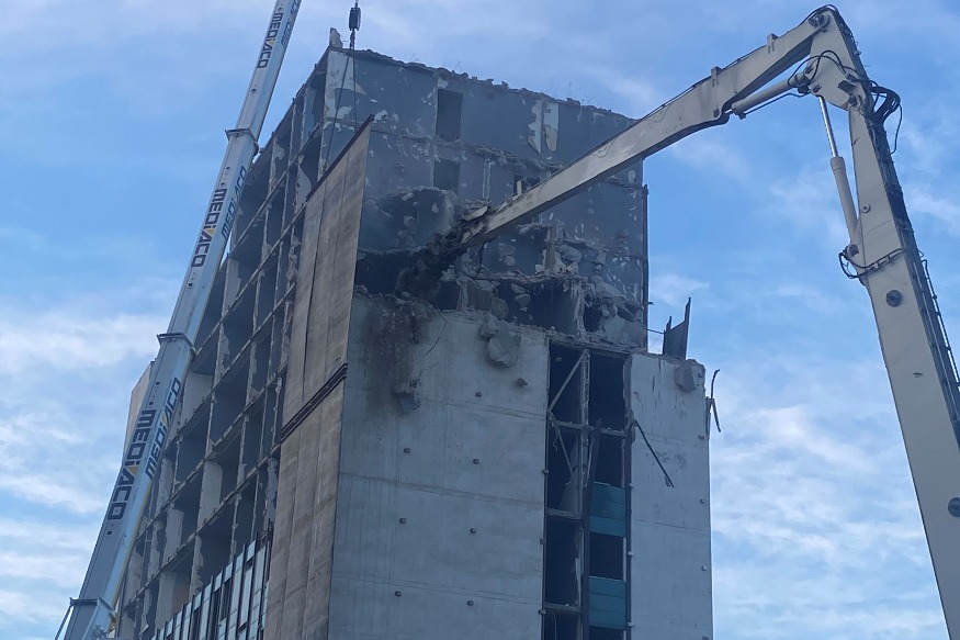 Ça y’est, c’est la dernière étape de démolition pour le bâtiment D de la Verrerie. La tour bleue et blanche va cette fois disparaitre du paysage du quartier après plus de 8 mois de travaux. Après les étapes nécessaires de curage et de désamiantage, place à la phase la plus spectaculaire.