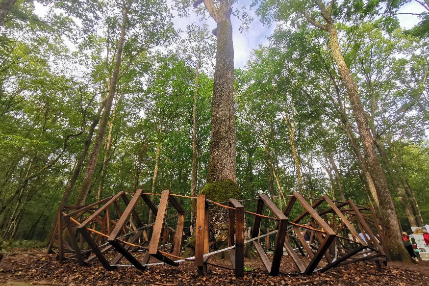 Ils ont près de 400 ans, mesurent jusqu’à 47 mètres de haut, avec des circonférences pouvant atteindre 6 mètres. Cinq chênes remarquables de la forêt de Tronçais bénéficient désormais chacun d’écrins conçus par des artistes.