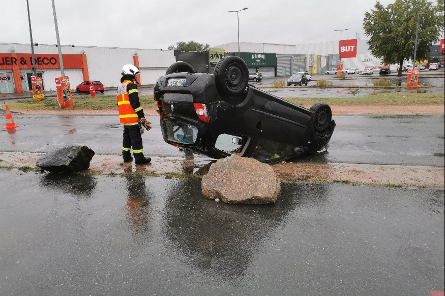 Sur une chaussée détrempée, elle aurait perdu le contrôle de son vehicule à la sortie d'une courbe, près de l'enseigne "V and B". Le véhicule, une Renault Twingo, s'est retrouvé sur le toit.