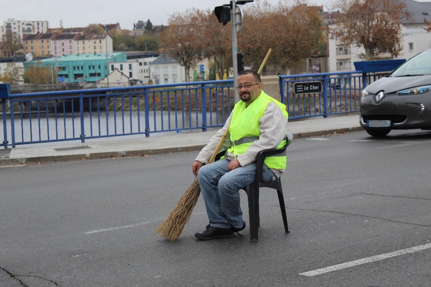 Loin de l’effervescence des lieux de blocage, Eric manifestait à sa façon le 17 novembre : il s’installait, sur une chaise, un balai à la main, en plein milieu du pont Saint-Pierre, un gilet jaune sur le dos